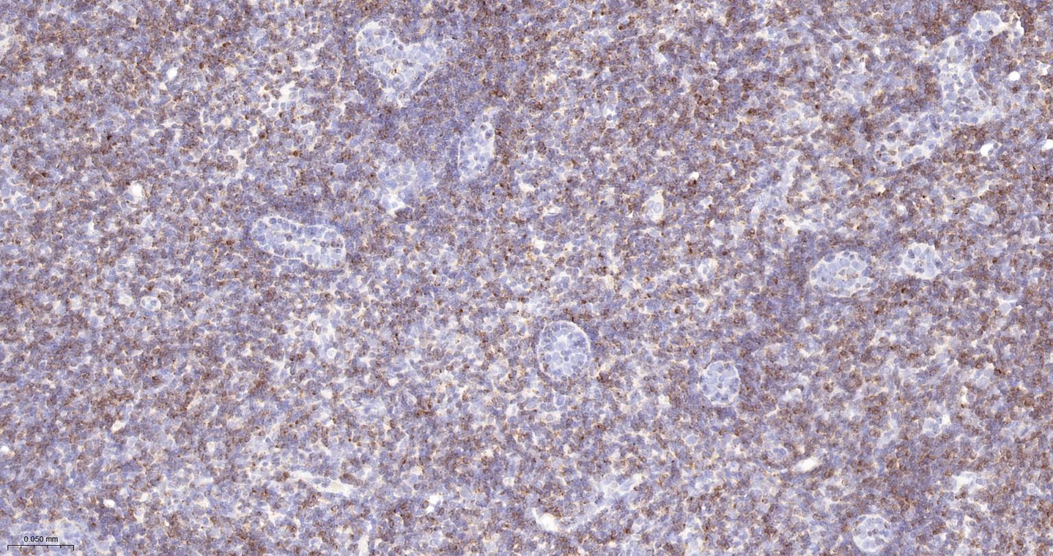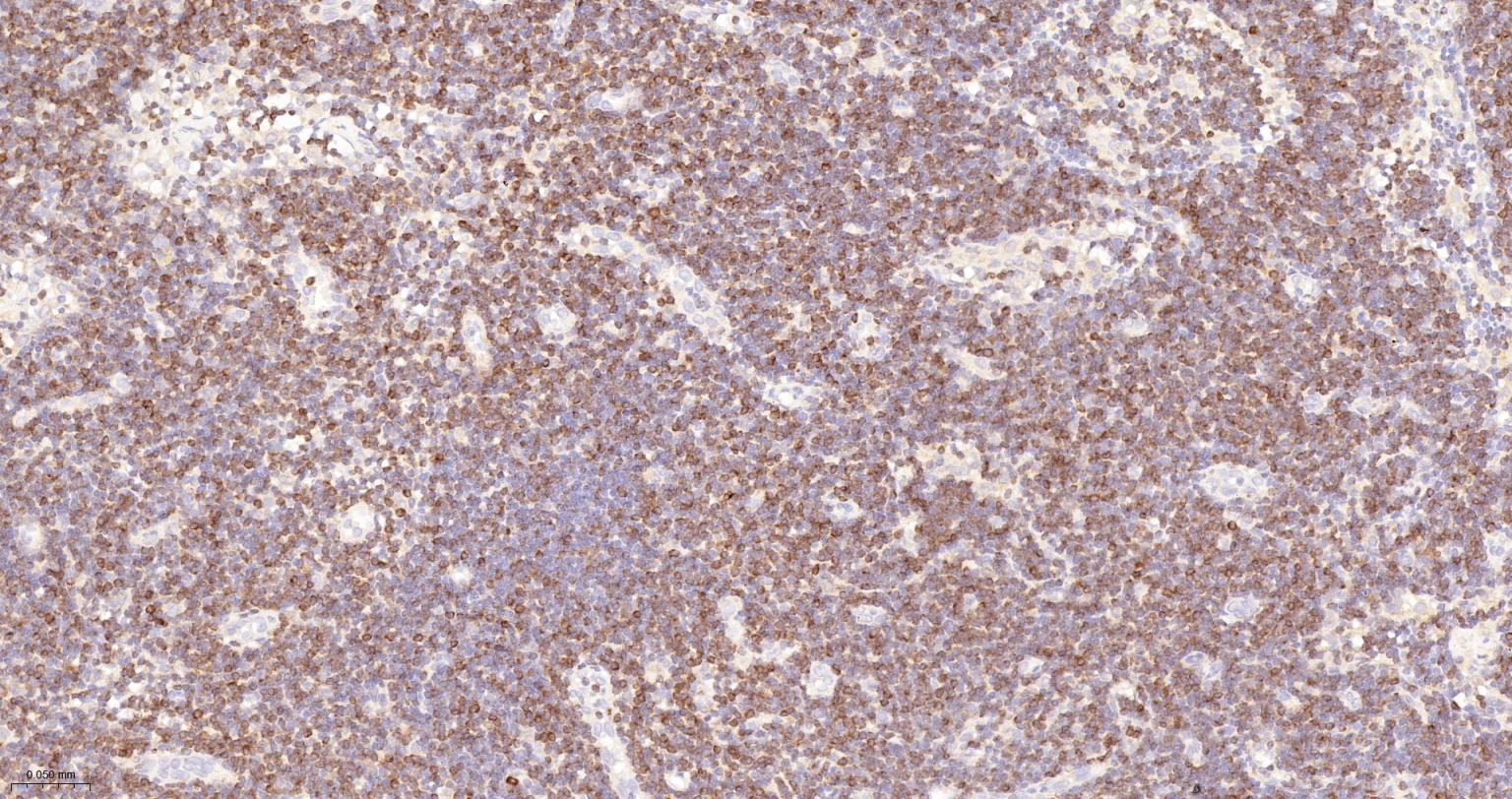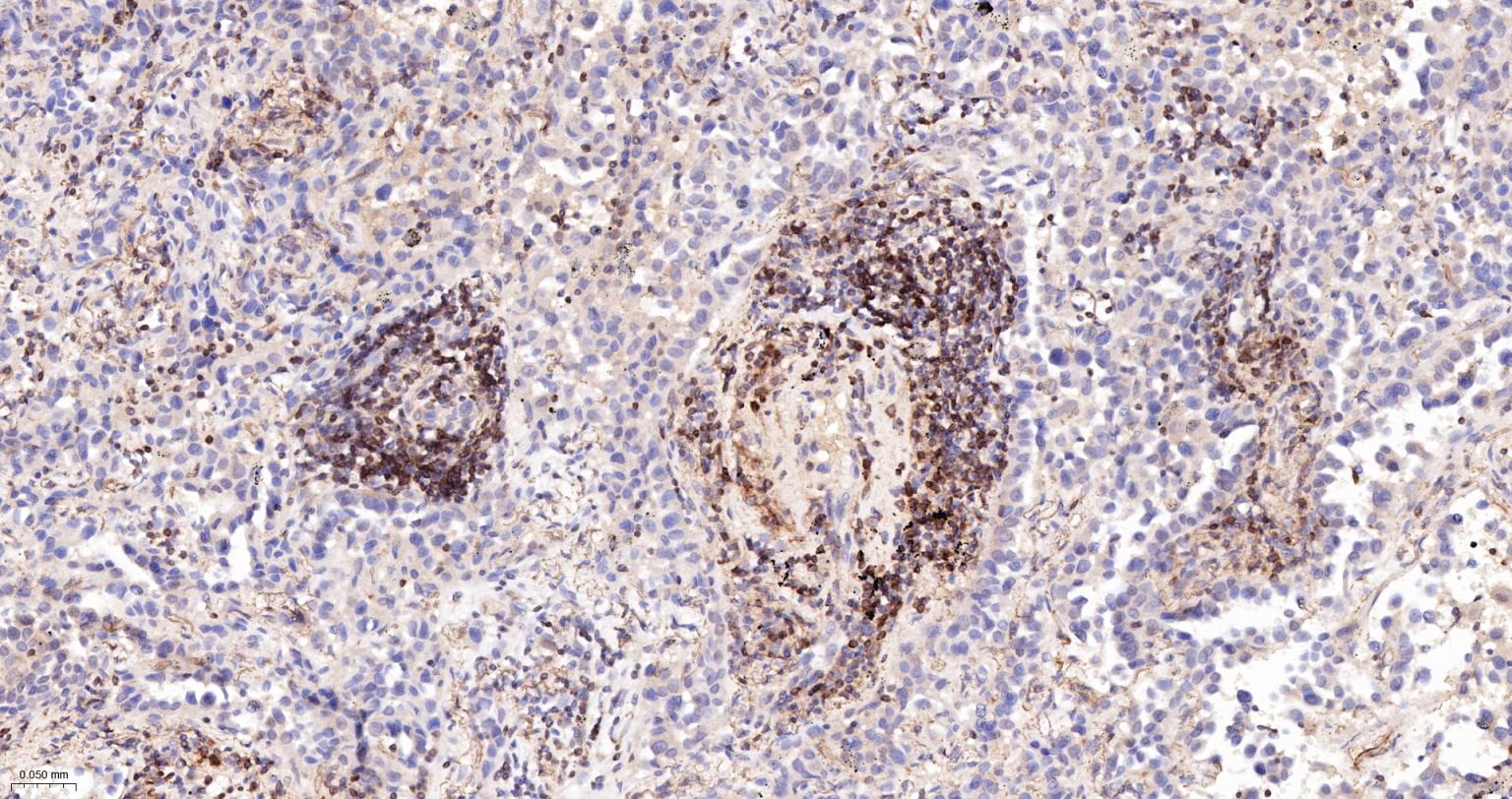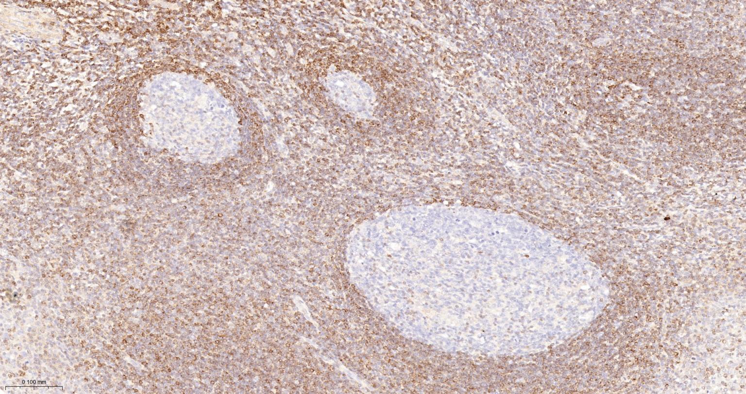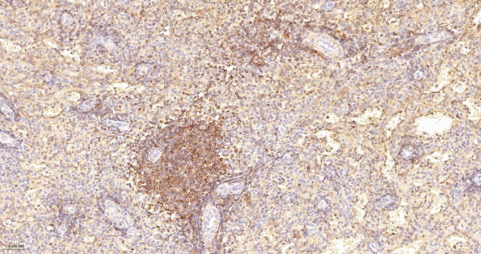 Paraformaldehyde-fixed, paraffin embedded Human Spleen; Antigen retrieval by boiling in sodium citrate buffer (pH6.0) for 15 min; Antibody incubation with Bcl-2 Monoclonal Antibody, Unconjugated(bsm-61074R) at 1:200 overnight at 4°C, followed by conjugation to the SP Kit (Rabbit, SP-0023)and DAB (C-0010) staining.