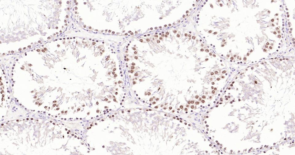 Paraformaldehyde-fixed, paraffin embedded Rat Testicles; Antigen retrieval by boiling in sodium citrate buffer (pH6.0) for 15 min; Antibody incubation with TOP2A Monoclonal Antibody, Unconjugated(bsm-61077R) at 1:200 overnight at 4°C, followed by conjugation to the SP Kit (Rabbit, SP-0023) and DAB (C-0010) staining.