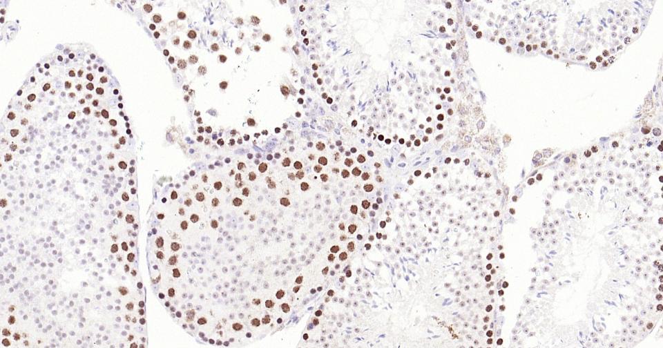 Paraformaldehyde-fixed, paraffin embedded Mouse Testicles; Antigen retrieval by boiling in sodium citrate buffer (pH6.0) for 15 min; Antibody incubation with TOP2A Monoclonal Antibody, Unconjugated(bsm-61077R) at 1:200 overnight at 4°C, followed by conjugation to the SP Kit (Rabbit, SP-0023) and DAB (C-0010) staining.