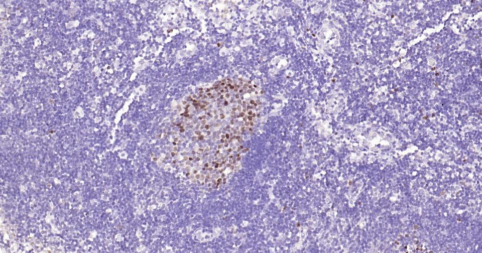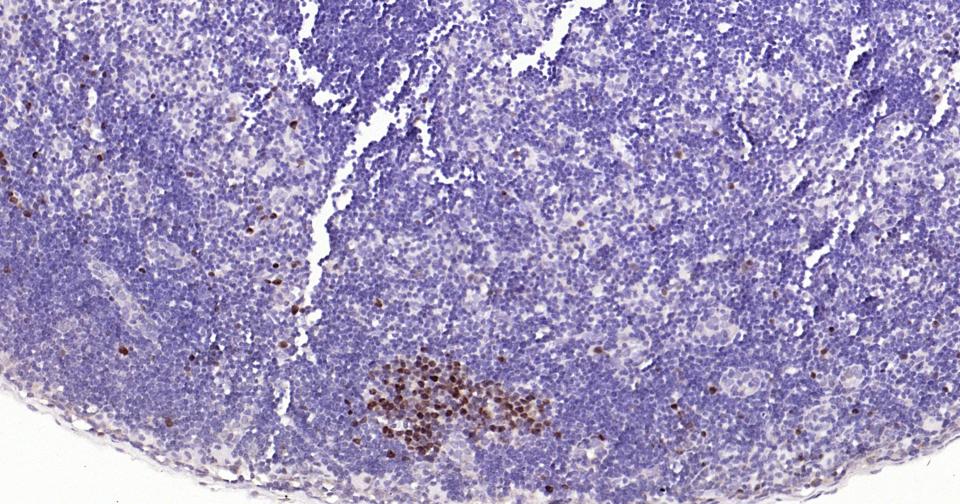 Paraformaldehyde-fixed, paraffin embedded Mouse Lymph; Antigen retrieval by boiling in sodium citrate buffer (pH6.0) for 15 min; Antibody incubation with TOP2A Monoclonal Antibody, Unconjugated(bsm-61077R) at 1:400 overnight at 4°C, followed by conjugation to the SP Kit (Rabbit, SP-0023) and DAB (C-0010) staining.