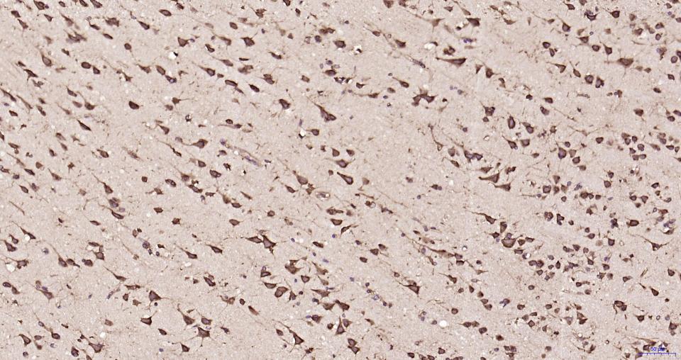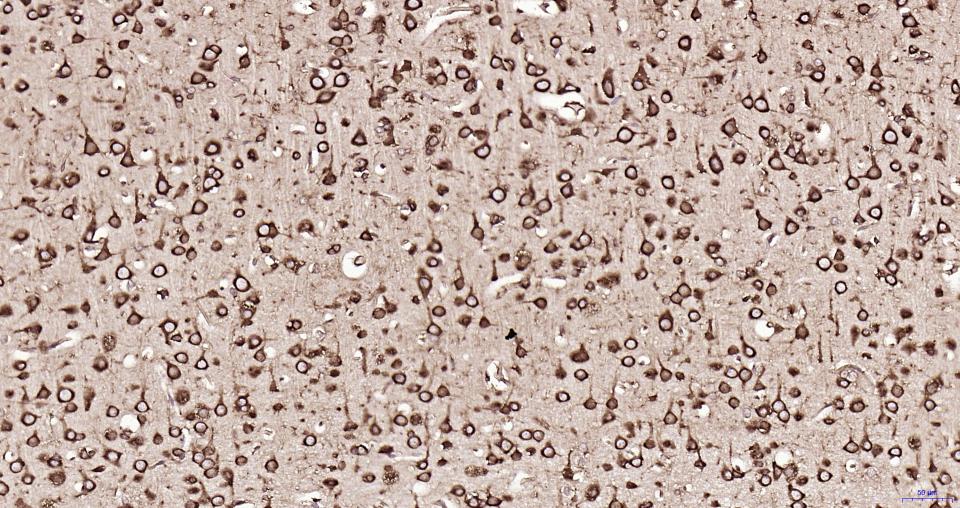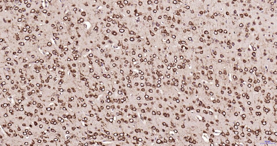 Paraformaldehyde-fixed, paraffin embedded Rat Cerebrum; Antigen retrieval by boiling in sodium citrate buffer (pH6.0) for 15 min; Antibody incubation with RPS19 Monoclonal Antibody, Unconjugated(bsm-54242R) at 1:200 overnight at 4°C, followed by conjugation to the SP Kit(Rabbit, SP-0023) and DAB (C-0010) staining.
