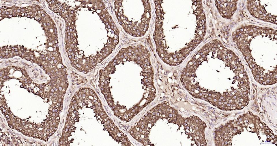 Paraformaldehyde-fixed, paraffin embedded Human Testicles; Antigen retrieval by boiling in sodium citrate buffer (pH6.0) for 15 min; Antibody incubation with RPS19 Monoclonal Antibody, Unconjugated(bsm-54242R) at 1:200 overnight at 4°C, followed by conjugation to the SP Kit(Rabbit, SP-0023) and DAB (C-0010) staining.