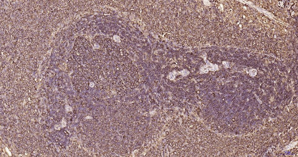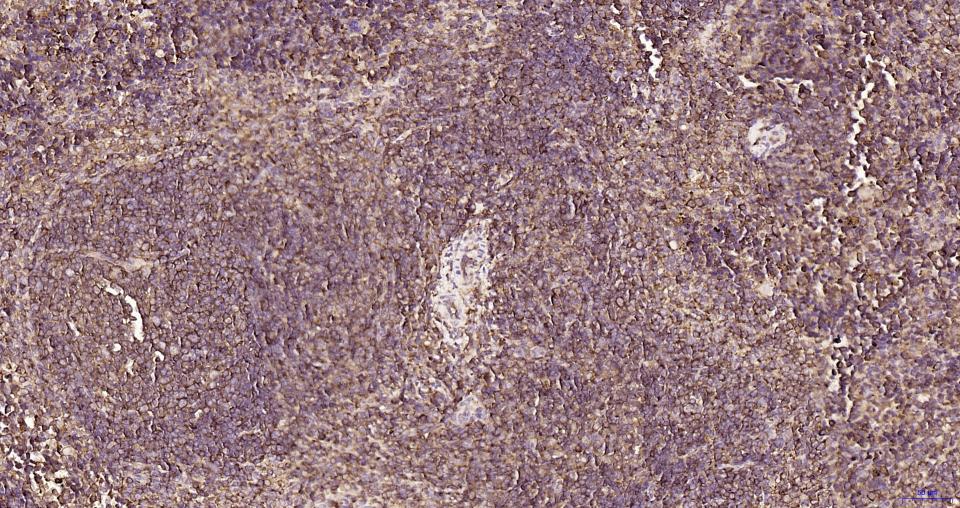 Paraformaldehyde-fixed, paraffin embedded Human Spleen; Antigen retrieval by boiling in sodium citrate buffer (pH6.0) for 15 min; Antibody incubation with RPS19 Monoclonal Antibody, Unconjugated(bsm-54242R) at 1:200 overnight at 4°C, followed by conjugation to the SP Kit(Rabbit, SP-0023) and DAB (C-0010) staining.