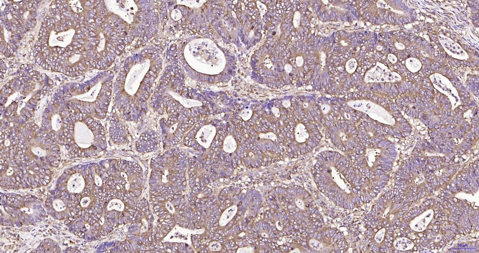 Paraformaldehyde-fixed, paraffin embedded Human Colon Cancer; Antigen retrieval by boiling in sodium citrate buffer (pH6.0) for 15 min; Antibody incubation with RPS19 Monoclonal Antibody, Unconjugated(bsm-54242R) at 1:200 overnight at 4°C, followed by conjugation to the SP Kit(Rabbit, SP-0023) and DAB (C-0010) staining.