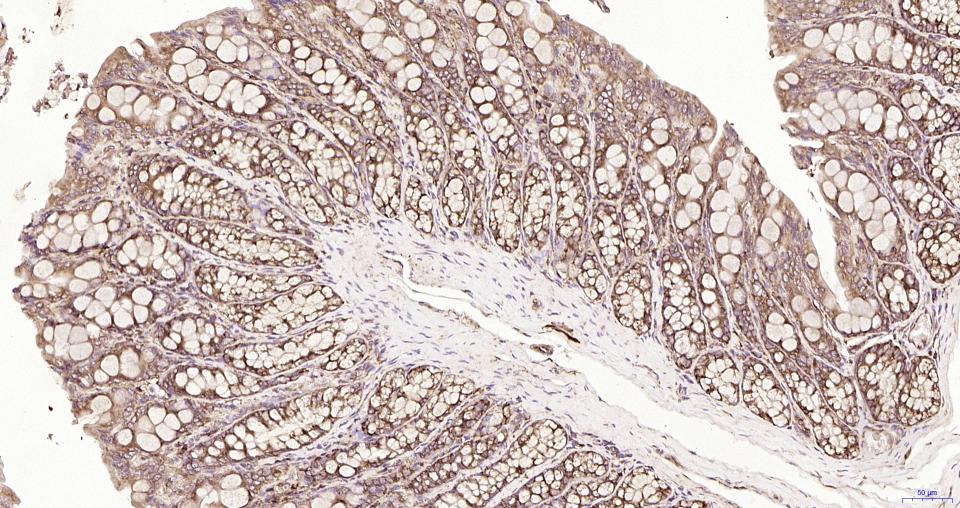Paraformaldehyde-fixed, paraffin embedded Mouse Colon; Antigen retrieval by boiling in sodium citrate buffer (pH6.0) for 15 min; Antibody incubation with RPS19 Monoclonal Antibody, Unconjugated(bsm-54242R) at 1:200 overnight at 4°C, followed by conjugation to the SP Kit(Rabbit, SP-0023) and DAB (C-0010) staining.