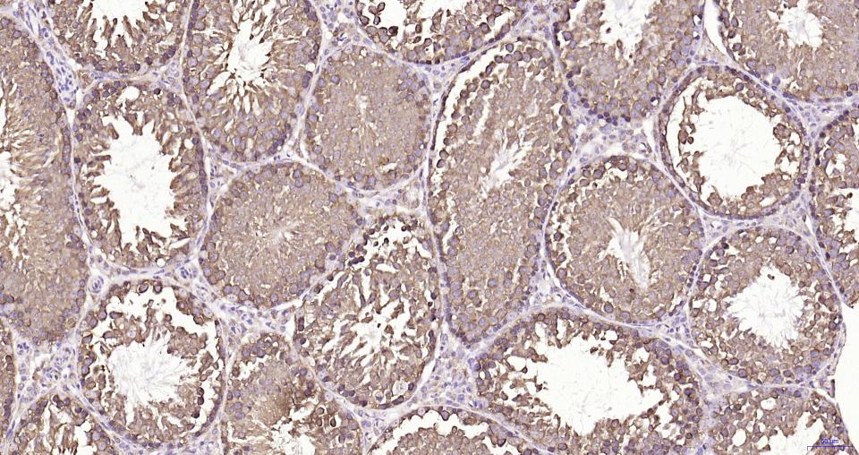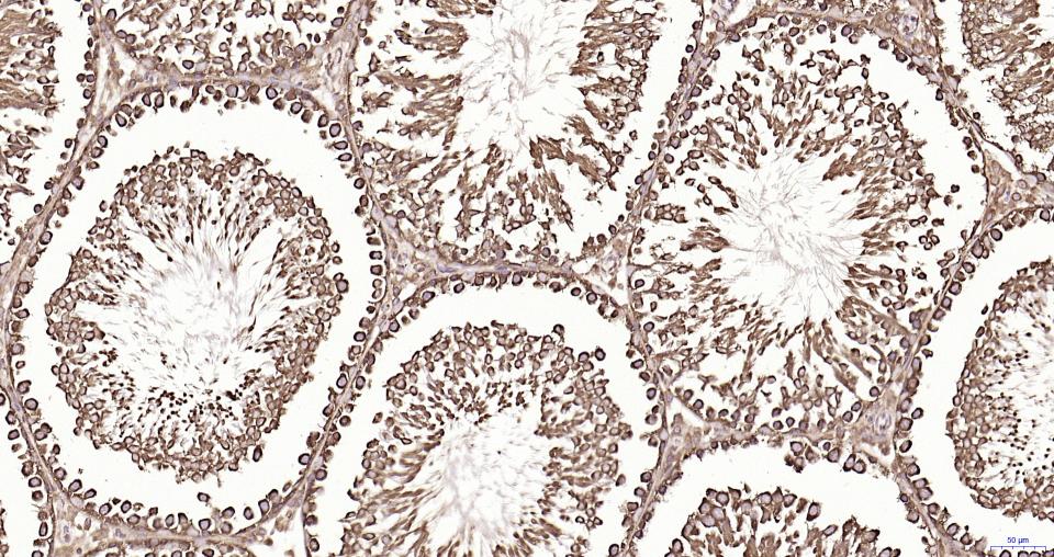 Paraformaldehyde-fixed, paraffin embedded Mouse Testicles; Antigen retrieval by boiling in sodium citrate buffer (pH6.0) for 15 min; Antibody incubation with RPS19 Monoclonal Antibody, Unconjugated(bsm-54242R) at 1:200 overnight at 4°C, followed by conjugation to the SP Kit(Rabbit, SP-0023) and DAB (C-0010) staining.