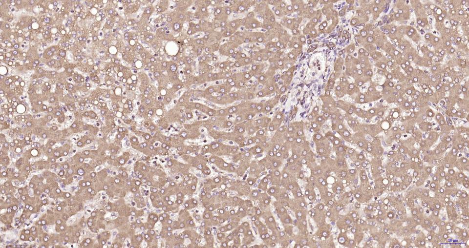 Paraformaldehyde-fixed, paraffin embedded Human Liver; Antigen retrieval by boiling in sodium citrate buffer (pH6.0) for 15 min; Antibody incubation with RPS19 Monoclonal Antibody, Unconjugated(bsm-54242R) at 1:200 overnight at 4°C, followed by conjugation to the SP Kit(Rabbit, SP-0023) and DAB (C-0010) staining.