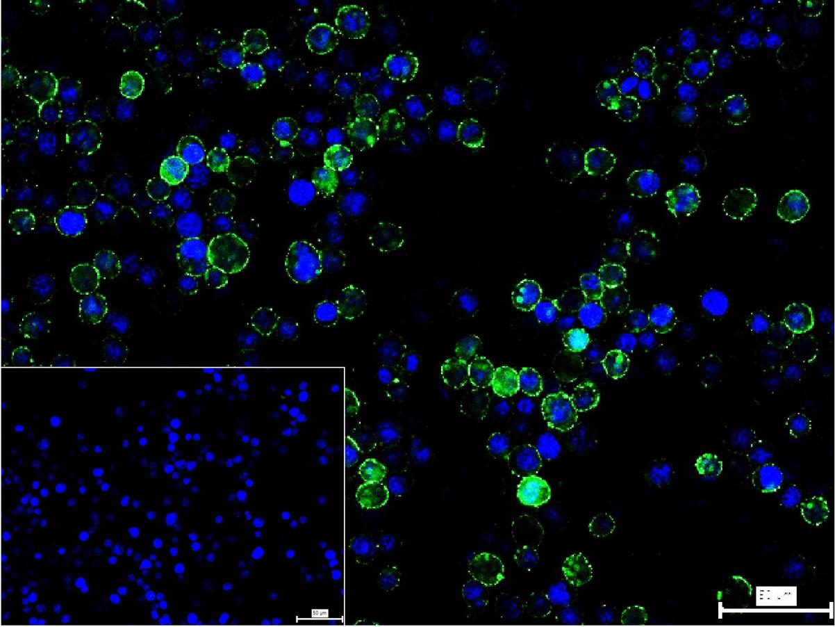 4% Paraformaldehyde-fixed Jurkat (H) cell; Antibody incubation with (CD31) monoclonal Antibody, unconjugated (bsm-43666M) 1:100, 90 min at 37°C; followed by conjugated Goat Anti-Mouse IgG antibody (green, bs-60296G-BF488) at 37°C for 90 min, DAPI (blue, C02-04002) was used to stain the cell nuclei. PBS instead of the primary antibody was used as the blank control.