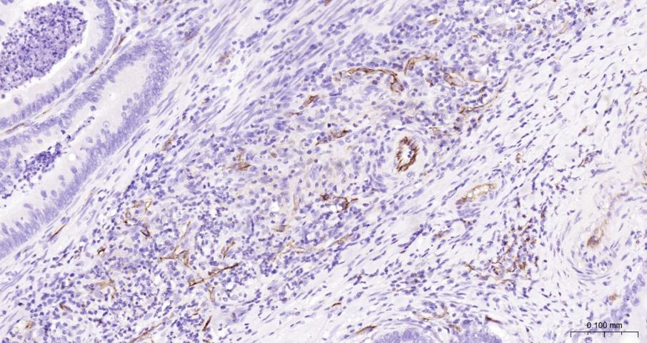 Paraformaldehyde-fixed, paraffin embedded Human Colon Cancer; Antigen retrieval by boiling in sodium citrate buffer (pH6.0) for 15 min; The section was incubated with CD31 Monoclonal Antibody, Unconjugated (bsm-43666M) at 1:200 overnight at 4°C, followed by conjugation to the bs-40296G-HRP and DAB (C-0010) staining.
