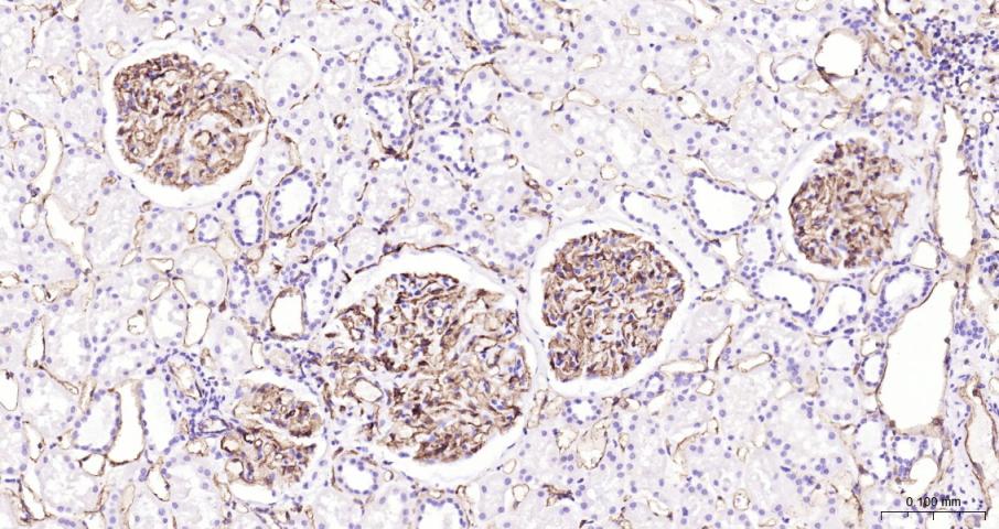 Paraformaldehyde-fixed, paraffin embedded Human Kidney; Antigen retrieval by boiling in sodium citrate buffer (pH6.0) for 15 min; The section was incubated with CD31 Monoclonal Antibody, Unconjugated (bsm-43666M) at 1:200 overnight at 4°C, followed by conjugation to the bs-40296G-HRP and DAB (C-0010) staining.