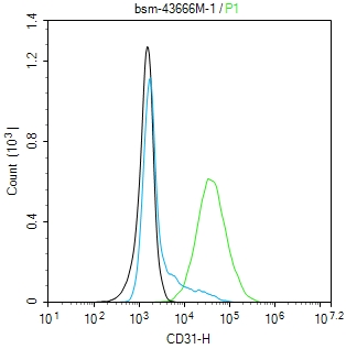 The EA.hy926(H) cells were incubated in 5%BSA to block non-specific protein-protein interactions (30 min at r.t.). Primary Antibody (green): Mouse Anti-CD31 antibody (bsm-43666M): 1 μg/10^6 cells; Secondary Antibody (white blue): Goat anti-Mouse IgG-BF488(bs-60296G-BF488): 1 μg/test. Blank control (black): PBS. Acquisition of 20,000 events was performed.