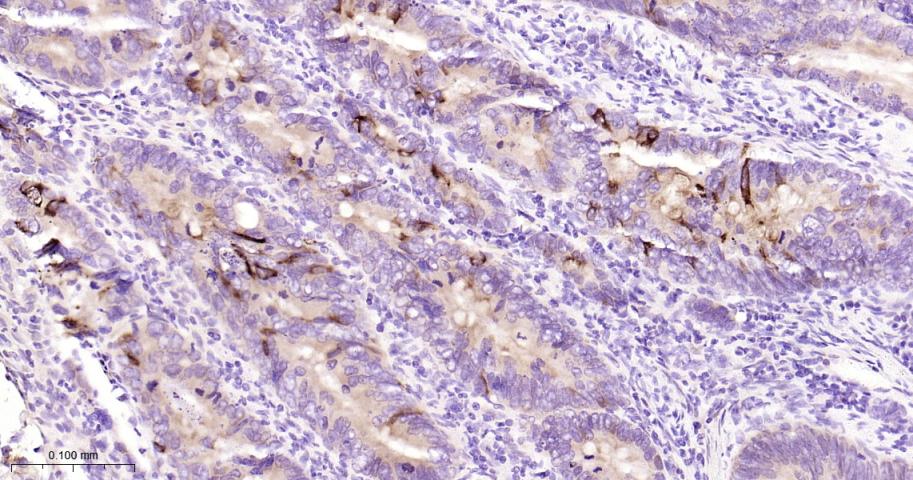 Paraformaldehyde-fixed, paraffin embedded Human Colon Cancer; Antigen retrieval by boiling in sodium citrate buffer (pH6.0) for 15 min; Antibody incubation with Trefoil factor 1 Monoclonal Antibody, Unconjugated(bsm-54139R) at 1:200 overnight at 4°C, followed by conjugation to the bs-0295G-HRP and DAB (C-0010) staining.