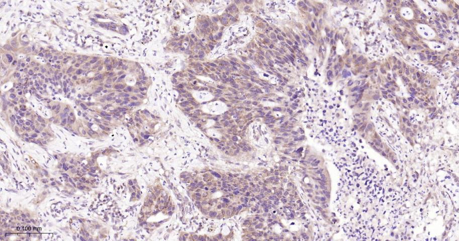 Paraformaldehyde-fixed, paraffin embedded Human Lung Cancer; Antigen retrieval by boiling in sodium citrate buffer (pH6.0) for 15 min; Antibody incubation with Trefoil factor 1 Monoclonal Antibody, Unconjugated(bsm-54139R) at 1:200 overnight at 4°C, followed by conjugation to the bs-0295G-HRP and DAB (C-0010) staining.