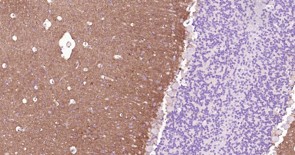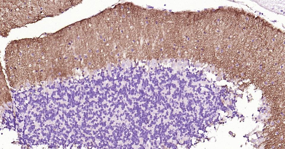 Paraformaldehyde-fixed, paraffin embedded Mouse Cerebellum; Antigen retrieval by boiling in sodium citrate buffer (pH6.0) for 15 min; Antibody incubation with EAAT1 Monoclonal Antibody, Unconjugated(bsm-60880R) at 1:200 overnight at 4°C, followed by conjugation to the bs-0295G-HRP and DAB (C-0010) staining.