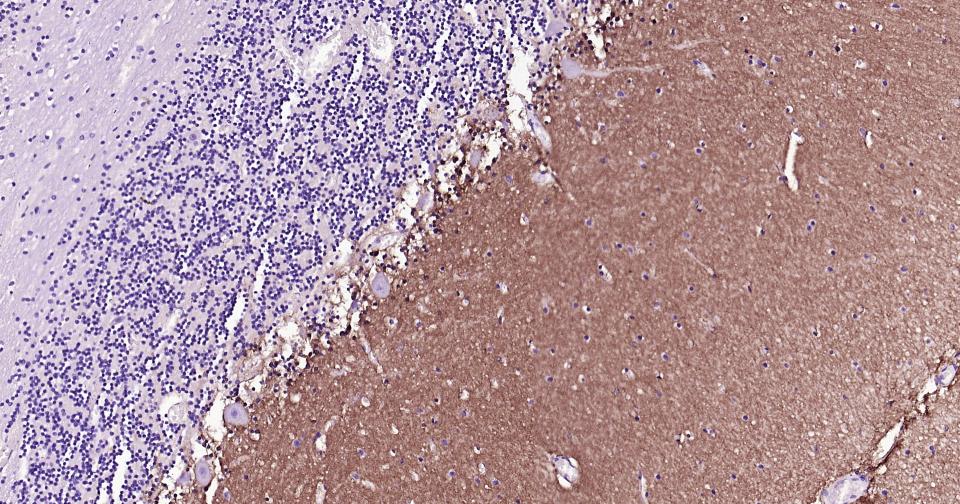 Paraformaldehyde-fixed, paraffin embedded Rat Cerebellum; Antigen retrieval by boiling in sodium citrate buffer (pH6.0) for 15 min; Antibody incubation with EAAT1 Monoclonal Antibody, Unconjugated(bsm-60880R) at 1:200 overnight at 4°C, followed by conjugation to the bs-0295G-HRP and DAB (C-0010) staining.