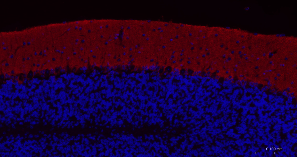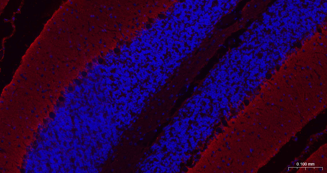Paraformaldehyde-fixed, paraffin embedded Mouse Cerebellum; Antigen retrieval by boiling in sodium citrate buffer (pH6.0) for 15 min; The section was incubated with EAAT1 Monoclonal Antibody, Unconjugated (bsm-60880R) at 1:200 overnight at 4°C. Followed by conjugated Goat Anti-Rabbit IgG antibody (Red, bs-0295G-BF594), DAPI (blue, C02-04002) was used to stain the cell nuclei.