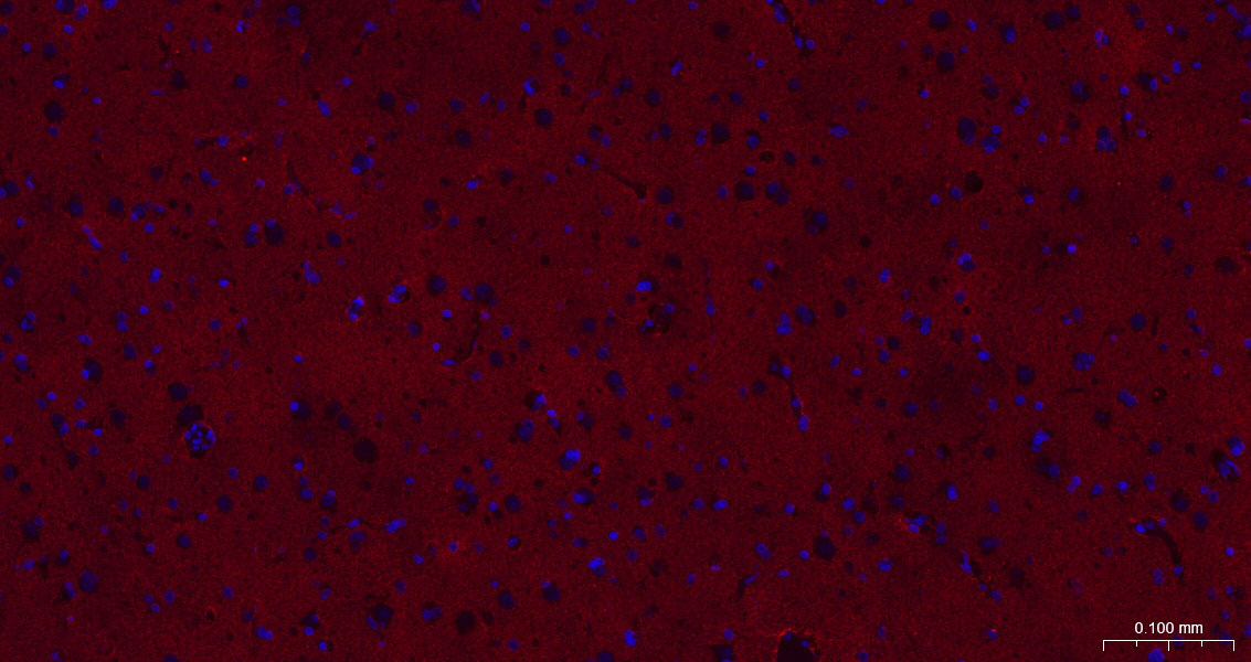 Paraformaldehyde-fixed, paraffin embedded Human Glioma; Antigen retrieval by boiling in sodium citrate buffer (pH6.0) for 15 min; The section was incubated with EAAT1 Monoclonal Antibody, Unconjugated (bsm-60880R) at 1:200 overnight at 4°C. Followed by conjugated Goat Anti-Rabbit IgG antibody (Red, bs-0295G-BF594), DAPI (blue, C02-04002) was used to stain the cell nuclei.