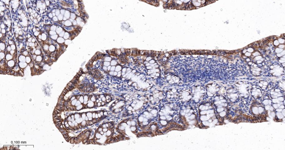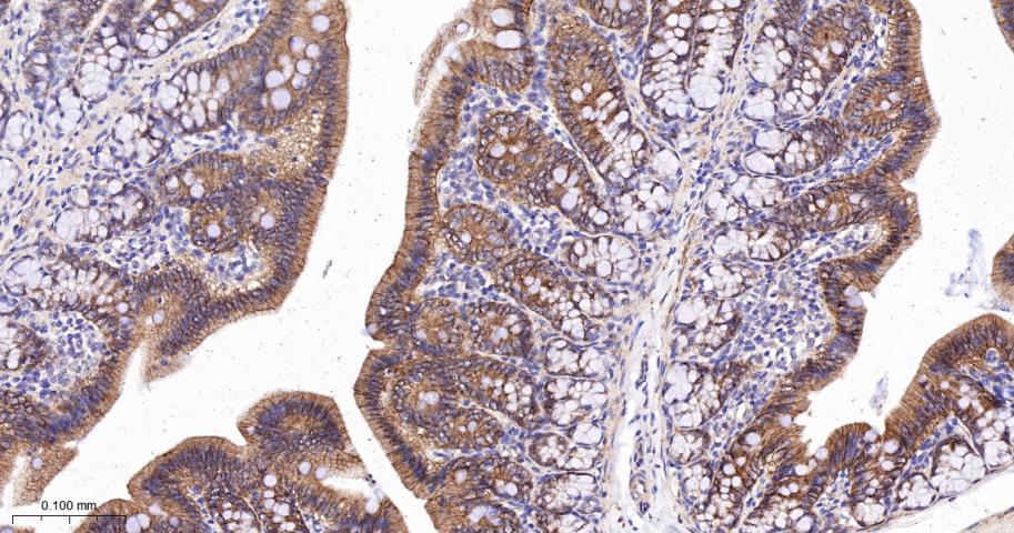 Paraformaldehyde-fixed, paraffin embedded Mouse Colon; Antigen retrieval by boiling in sodium citrate buffer (pH6.0) for 15 min; Antibody incubation with beta Catenin Monoclonal Antibody, Unconjugated(bsm-55526R) at 1:200 overnight at 4°C, followed by conjugation to the bs-0295G-HRP and DAB (C-0010) staining.