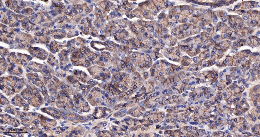 Paraformaldehyde-fixed, paraffin embedded Rat Pancreas; Antigen retrieval by boiling in sodium citrate buffer (pH6.0) for 15 min; Antibody incubation with beta Catenin Monoclonal Antibody, Unconjugated(bsm-55526R) at 1:200 overnight at 4°C, followed by conjugation to the bs-0295G-HRP and DAB (C-0010) staining.