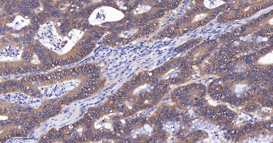 Paraformaldehyde-fixed, paraffin embedded Human Colon Cancer; Antigen retrieval by boiling in sodium citrate buffer (pH6.0) for 15 min; Antibody incubation with beta Catenin Monoclonal Antibody, Unconjugated(bsm-55526R) at 1:200 overnight at 4°C, followed by conjugation to the bs-0295G-HRP and DAB (C-0010) staining.