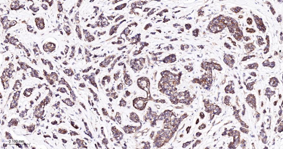 Paraformaldehyde-fixed, paraffin embedded Human Breast Cancer; Antigen retrieval by boiling in sodium citrate buffer (pH6.0) for 15 min; The section was incubated with Beta catenin Monoclonal Antibody, Unconjugated (bsm-55526R) at 1:200 overnight at 4°C, followed by conjugation to the bs-0295G-HRP and DAB (C-0010) staining.