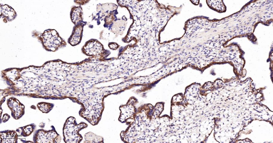 Paraformaldehyde-fixed, paraffin embedded Human Placenta; Antigen retrieval by boiling in sodium citrate buffer (pH6.0) for 15 min; The section was incubated with Beta catenin Monoclonal Antibody, Unconjugated (bsm-55526R) at 1:200 overnight at 4°C, followed by conjugation to the bs-0295G-HRP and DAB (C-0010) staining.