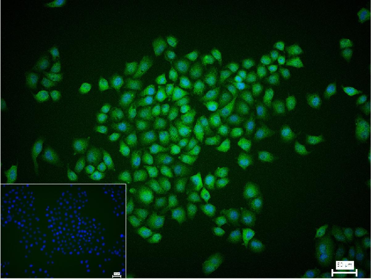 4% Paraformaldehyde-fixed Hela (H) cell; Triton X-100 at r.t. for 20 min; Antibody incubation with (p38) monoclonal Antibody, unconjugated (bsm-55529R) 1:100, 90 min at 37°C; followed by conjugated Goat Anti-Rabbit IgG antibody (green, bs-40295G-FITC) at 37°C for 90 min, DAPI (blue, C02-04002) was used to stain the cell nuclei. PBS instead of the primary antibody was used as the blank control.
