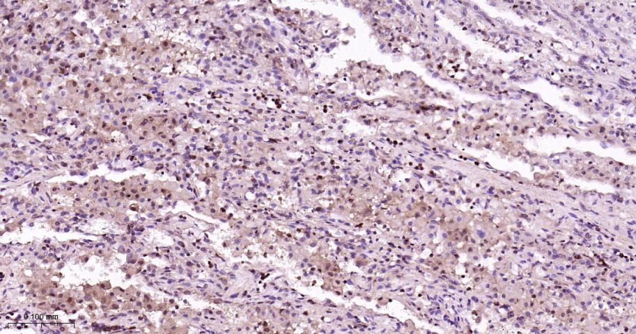 Paraformaldehyde-fixed, paraffin embedded Human Lung Cancer; Antigen retrieval by boiling in sodium citrate buffer (pH6.0) for 15 min; Antibody incubation with p38 Monoclonal Antibody, Unconjugated(bsm-55529R) at 1:200 overnight at 4°C, followed by conjugation to the bs-0295G-HRP and DAB (C-0010) staining.
