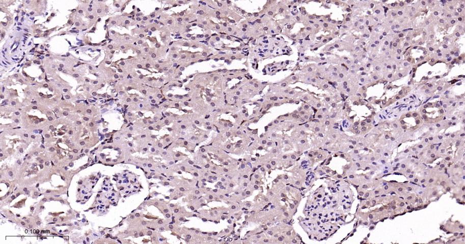 Paraformaldehyde-fixed, paraffin embedded Rat Kidney; Antigen retrieval by boiling in sodium citrate buffer (pH6.0) for 15 min; Antibody incubation with p38 Monoclonal Antibody, Unconjugated(bsm-55529R) at 1:200 overnight at 4°C, followed by conjugation to the bs-0295G-HRP and DAB (C-0010) staining.