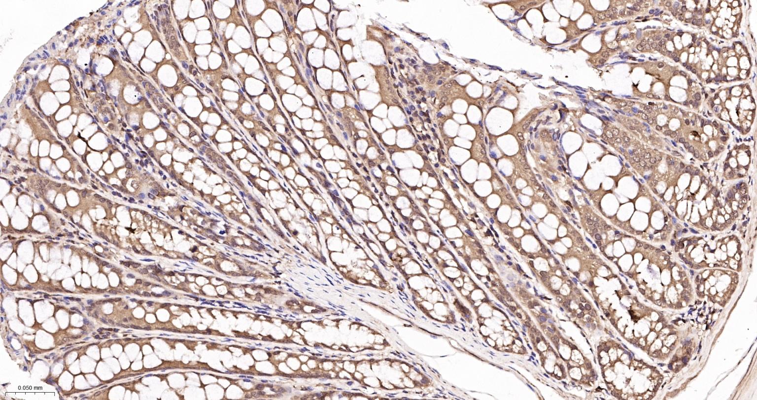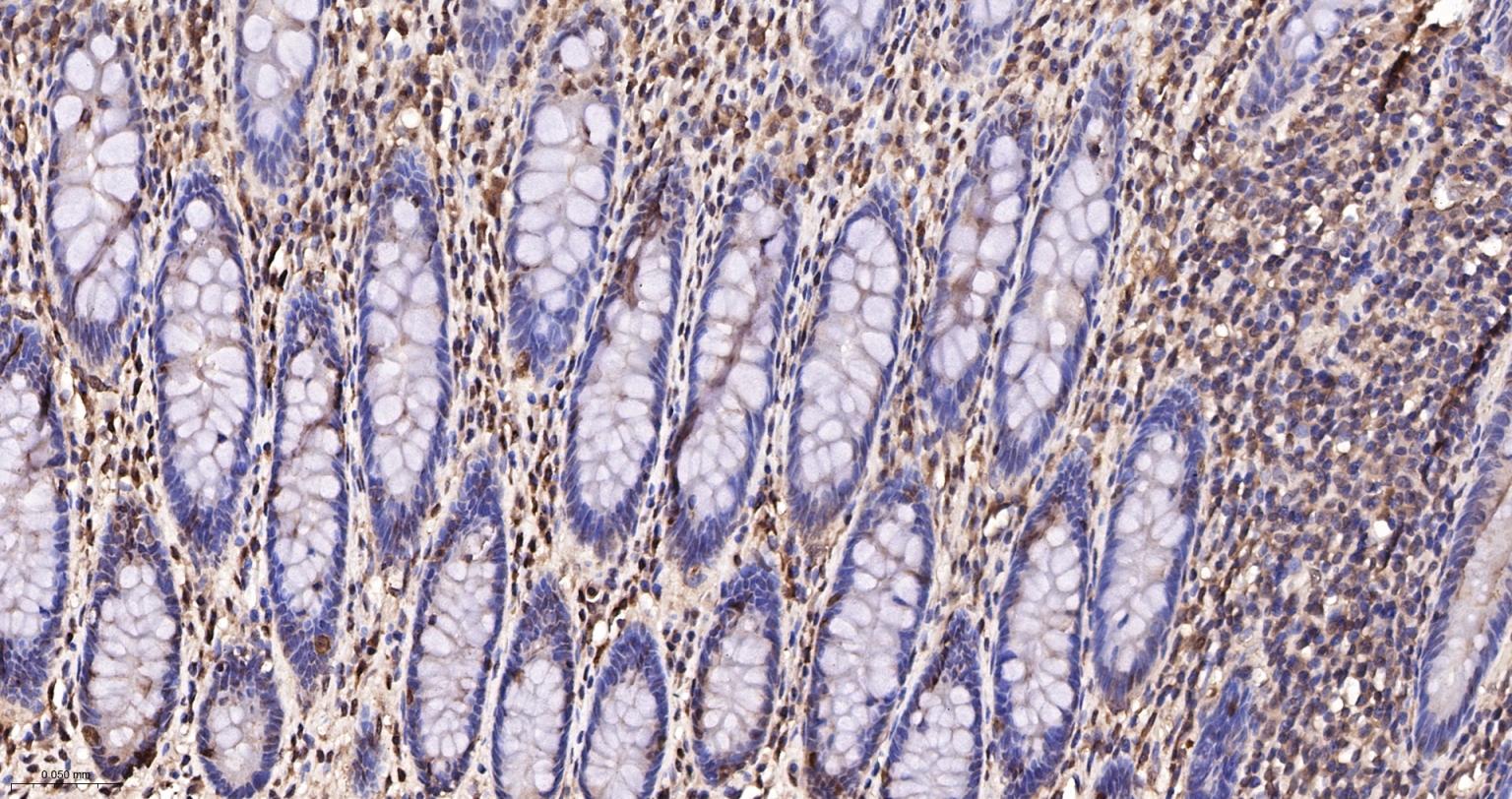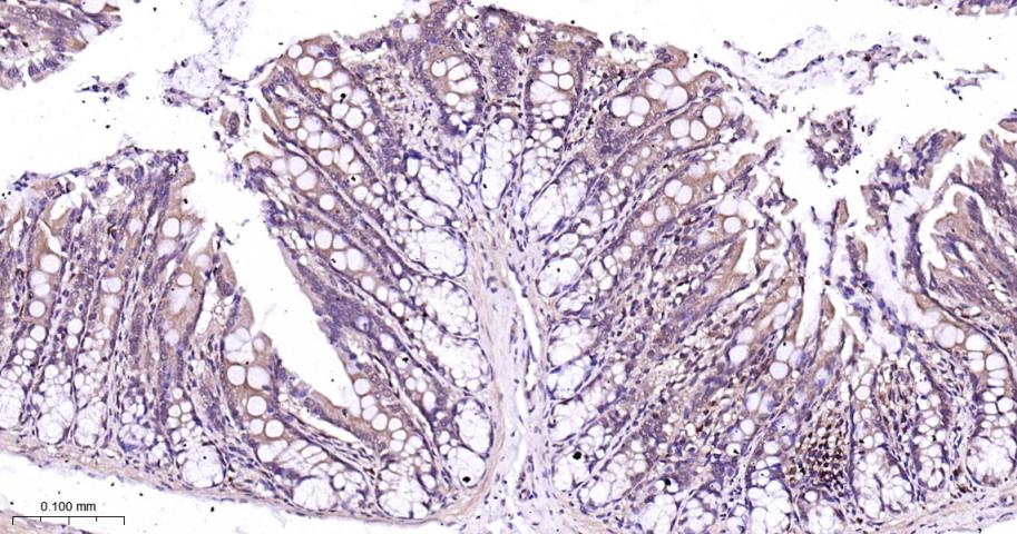 Paraformaldehyde-fixed, paraffin embedded Mouse Colon; Antigen retrieval by boiling in sodium citrate buffer (pH6.0) for 15 min; Antibody incubation with p38 Monoclonal Antibody, Unconjugated(bsm-55529R) at 1:200 overnight at 4°C, followed by conjugation to the bs-0295G-HRP and DAB (C-0010) staining.