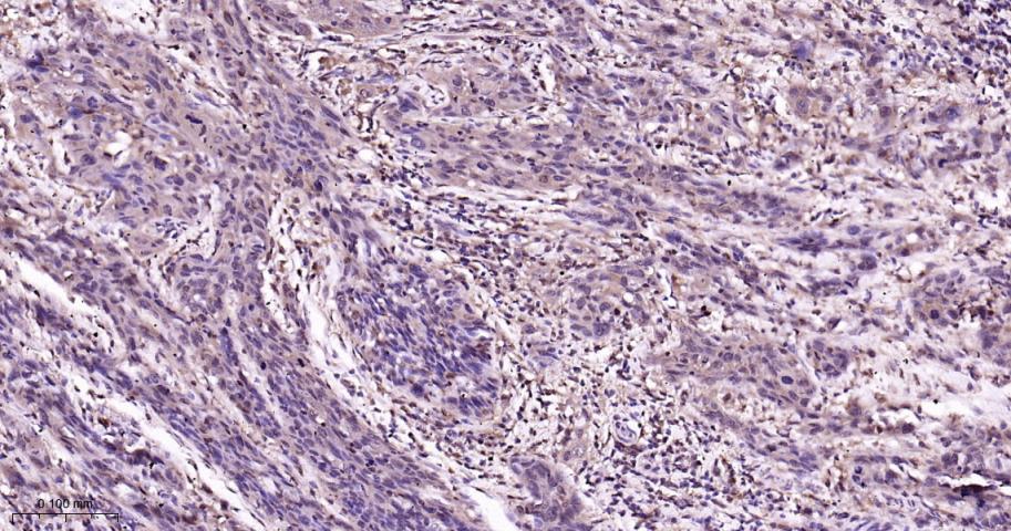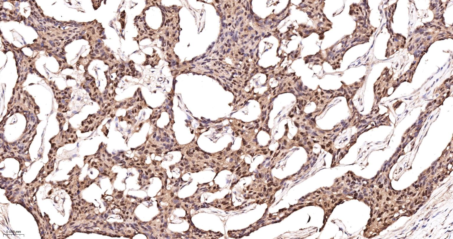 Paraformaldehyde-fixed, paraffin embedded Human Cervical Cancer; Antigen retrieval by boiling in sodium citrate buffer (pH6.0) for 15 min; Antibody incubation with p38 Monoclonal Antibody, Unconjugated(bsm-55529R) at 1:200 overnight at 4°C, followed by conjugation to the bs-0295G-HRP and DAB (C-0010) staining.