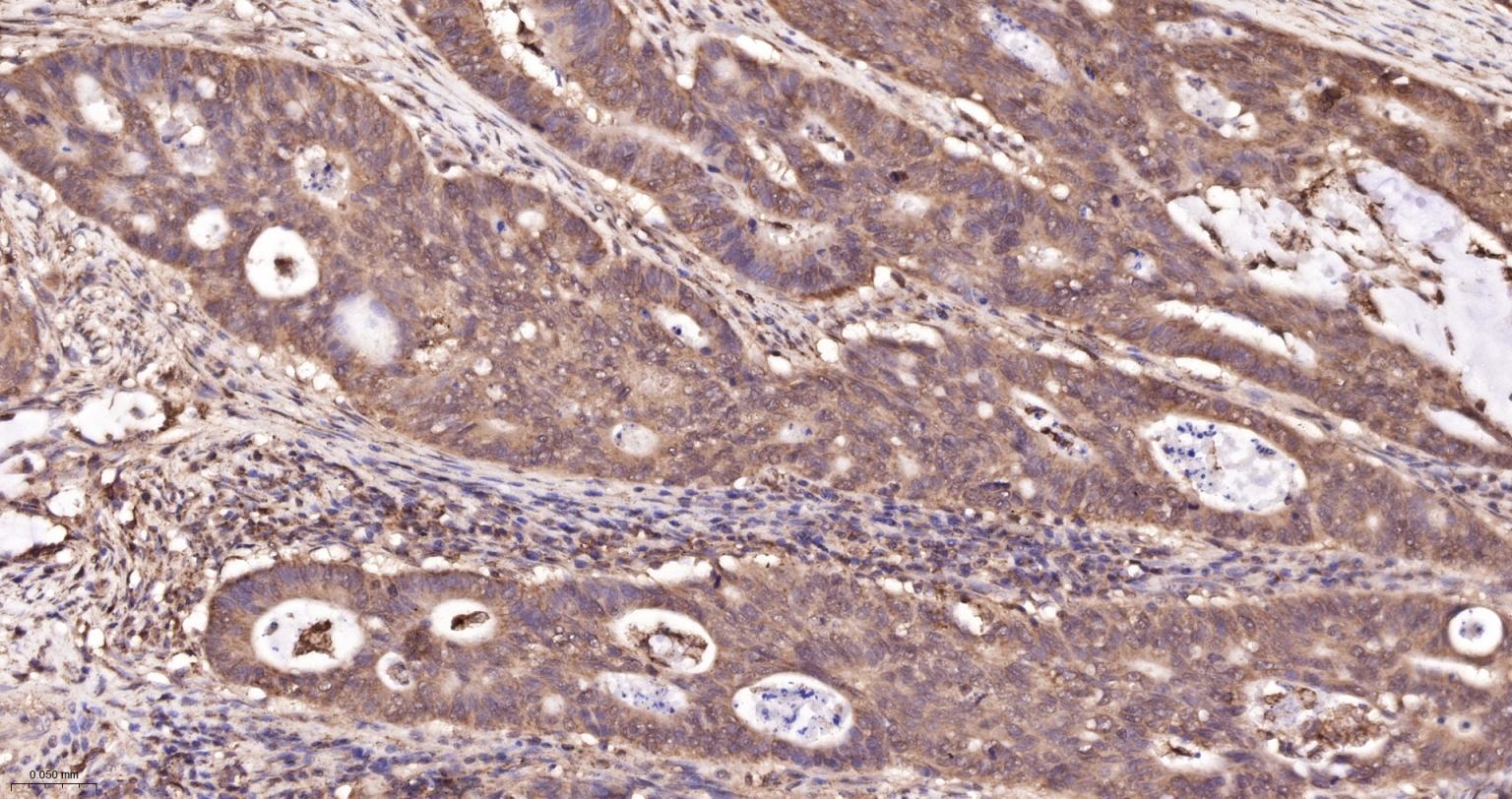 Paraformaldehyde-fixed, paraffin embedded Human Colon Cancer; Antigen retrieval by boiling in sodium citrate buffer (pH6.0) for 15 min; Antibody incubation with p38 Monoclonal Antibody, Unconjugated(bsm-55529R) at 1:200 overnight at 4°C, followed by conjugation to the bs-0295G-HRP and DAB (C-0010) staining.