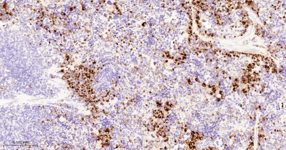 Paraformaldehyde-fixed, paraffin embedded Mouse Spleen; Antigen retrieval by boiling in sodium citrate buffer (pH6.0) for 15 min; The section was incubated with Myeloperoxidase Monoclonal Antibody, Unconjugated (bsm-55545R) at 1:500 overnight at 4°C, followed by conjugation to the bs-0295G-HRP and DAB (C-0010) staining.