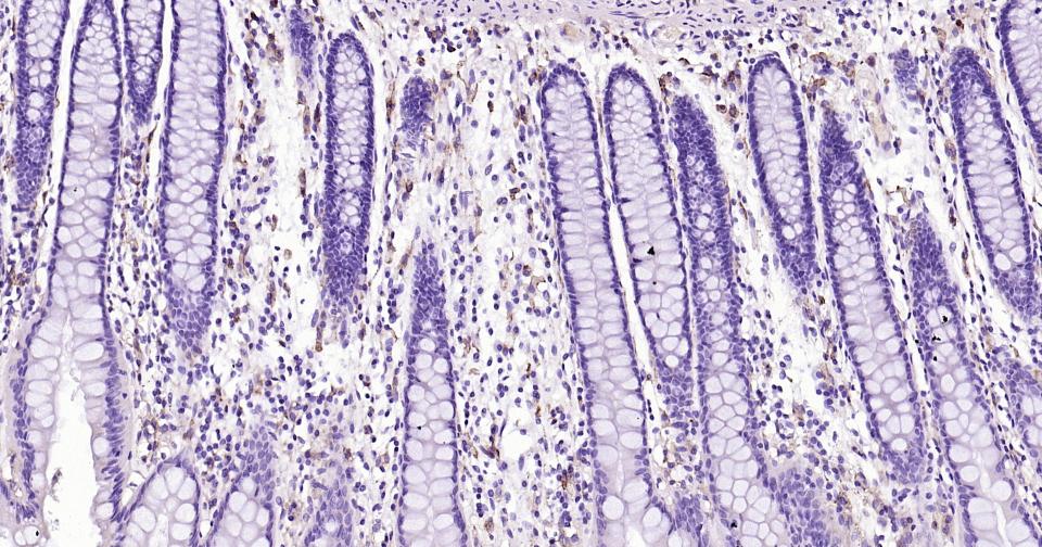 Paraformaldehyde-fixed, paraffin embedded Human Colon; Antigen retrieval by boiling in sodium citrate buffer (pH6.0) for 15 min; Antibody incubation with CD33 Monoclonal Antibody, Unconjugated(bsm-60920R) at 1:200 overnight at 4°C, followed by conjugation to the bs-0295G-HRP and DAB (C-0010) staining.