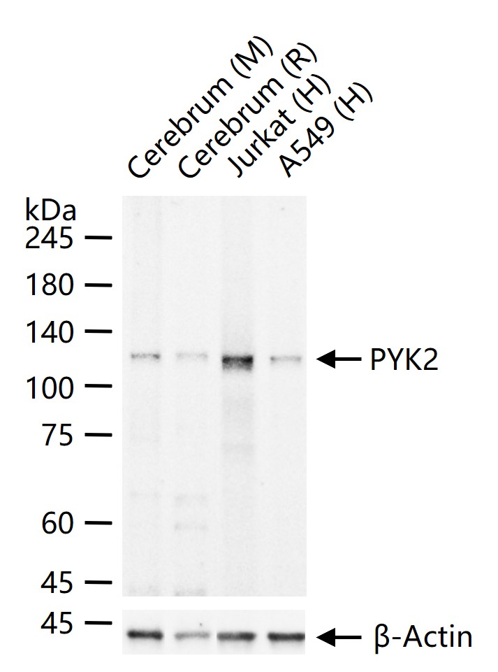 25 ug total protein per lane of various lysates (see on figure) probed with PYK2 monoclonal antibody, unconjugated (bsm-52553R) at 1:1000 dilution and 4°C overnight incubation. Followed by conjugated secondary antibody incubation at r.t. for 60 min.