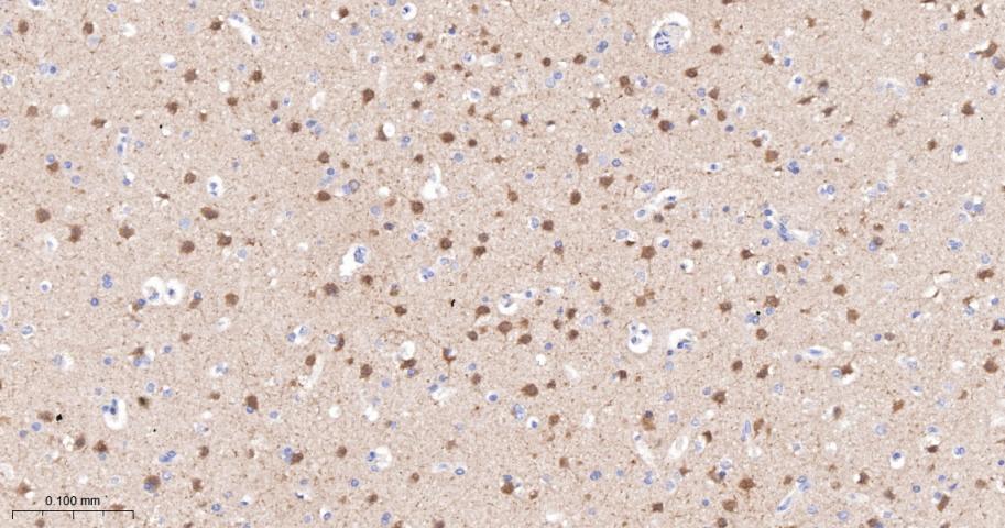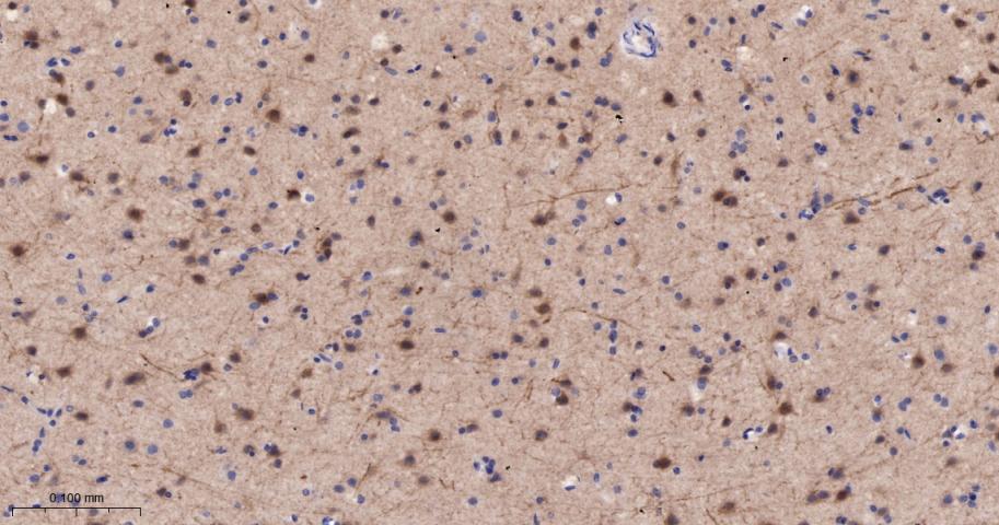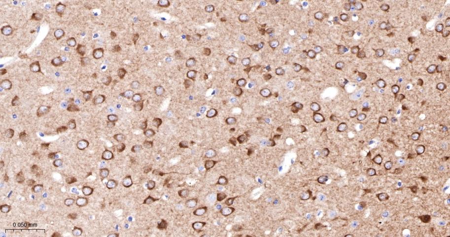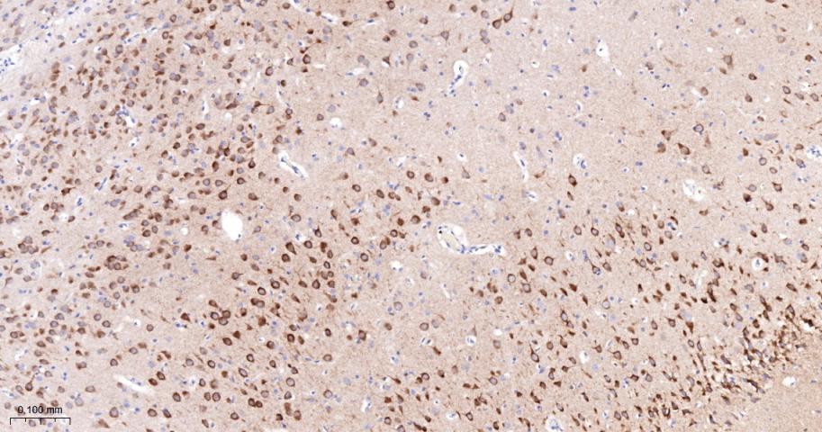 Paraformaldehyde-fixed, paraffin embedded Rat Cerebrum; Antigen retrieval by boiling in sodium citrate buffer (pH6.0) for 15 min; The section was incubated with PYK2 Monoclonal Antibody, Unconjugated (bsm-52553R) at 1:200 overnight at 4°C, followed by conjugation to the bs-0295G-HRP and DAB (C-0010) staining.