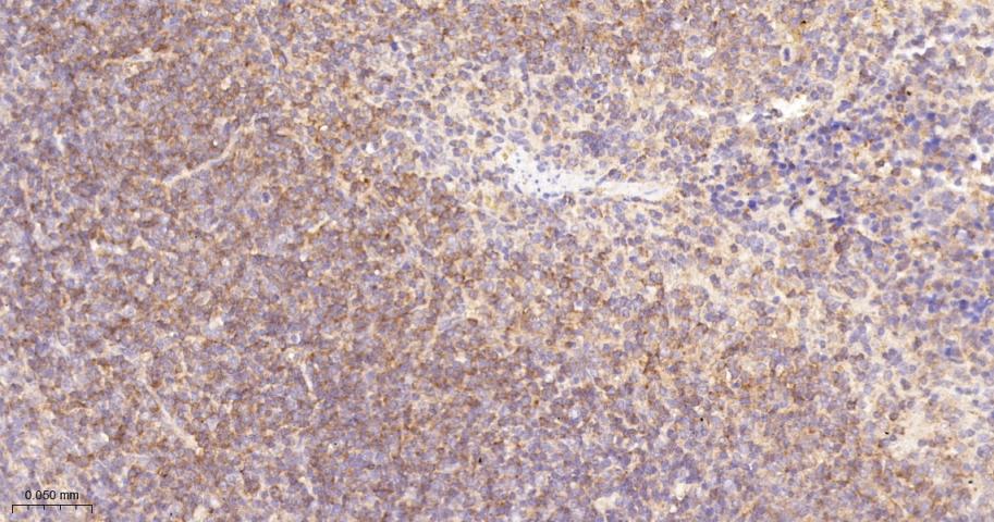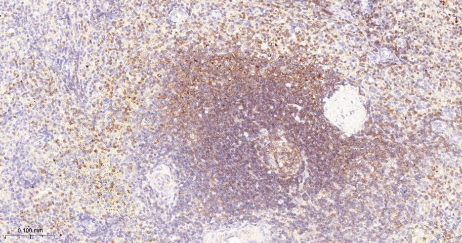 Paraformaldehyde-fixed, paraffin embedded Mouse Spleen; Antigen retrieval by boiling in sodium citrate buffer (pH6.0) for 15 min; The section was incubated with PYK2 Monoclonal Antibody, Unconjugated (bsm-52553R) at 1:200 overnight at 4°C, followed by conjugation to the bs-0295G-HRP and DAB (C-0010) staining.