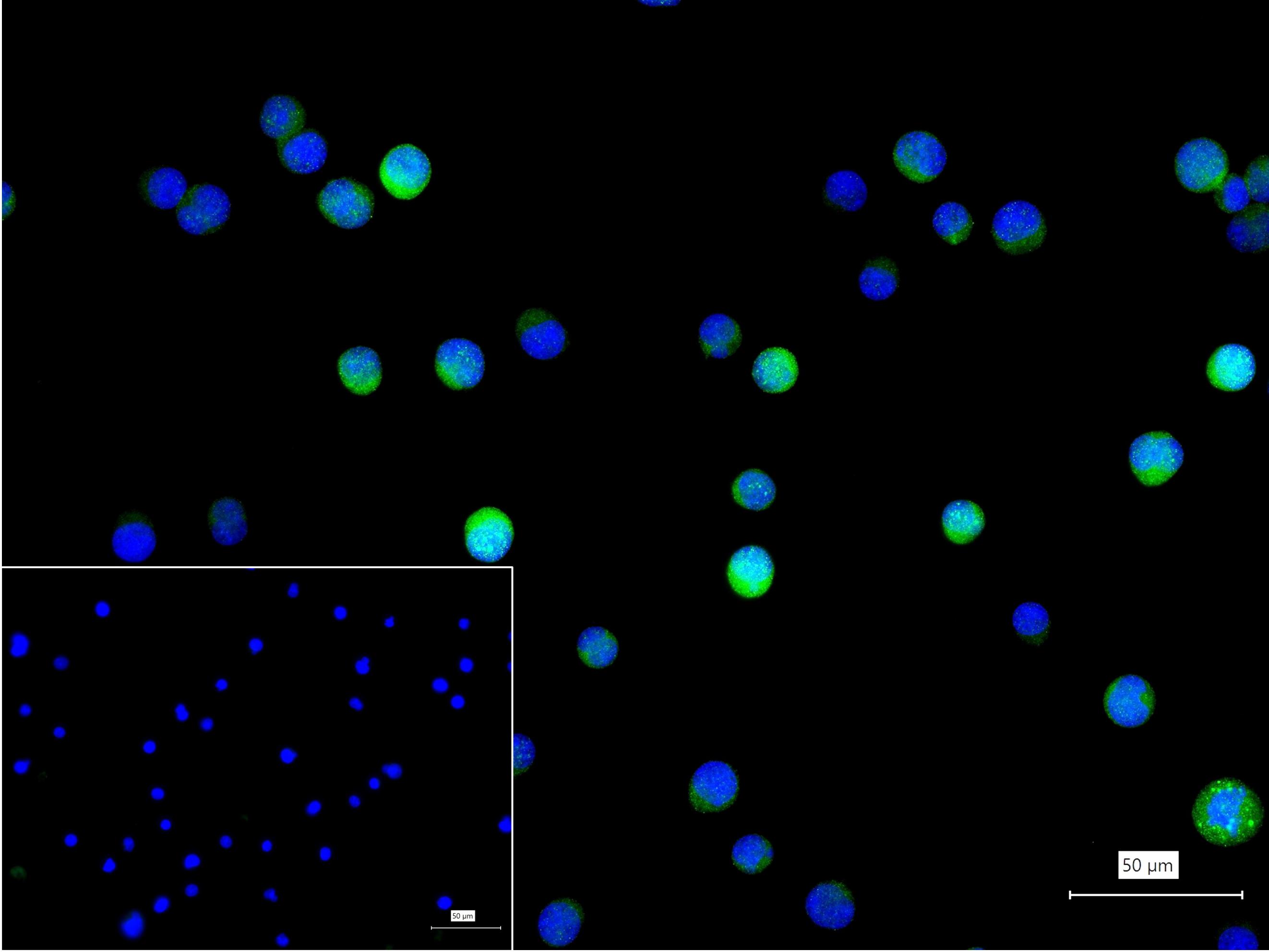 4% Paraformaldehyde-fixed Jurkat (H) cell; Triton X-100 at r.t. for 20 min; Antibody incubation with (PYK2) monoclonal Antibody, unconjugated (bsm-52553R) 1:100, 90 min at 37°C; followed by conjugated Goat Anti-Rabbit IgG antibody (green, bs-60295G-BF488) at 37°C for 90 min, DAPI (blue, C02-04002) was used to stain the cell nuclei. PBS instead of the primary antibody was used as the blank control.