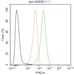 The Jurkat (H) cells were fixed with 4% PFA (10 min at r.t.) and then permeabilized with 90% ice-cold methanol for 20 min at -20℃,the cells then were incubated in 5%BSA to block non-specific protein-protein interactions (30 min at r.t.), followed by secondary antibody incubation for 40 min at room temperature. Primary Antibody (green):Rabbit Anti-PYK2 antibody (bsm-52553R,1:100); Isotype Control (orange): Rabbit IgG (bs-0295P). Blank control (black): PBS. Acquisition of 20,000 events was performed.
