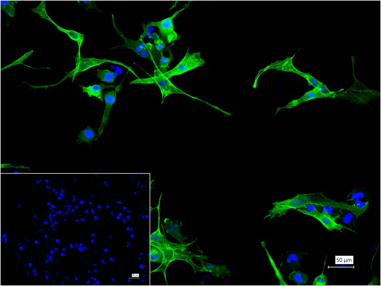 4% Paraformaldehyde-fixed RD (H) cell; Triton X-100 at r.t. for 20 min; Antibody incubation with (Actin) monoclonal Antibody, unconjugated (bsm-52832R) 1:100, 90 min at 37°C; followed by BF488 conjugated Goat Anti-Rabbit IgG antibody (green, bs-60295G-BF488) at 37°C for 90 min, DAPI (blue, C02-04002) was used to stain the cell nuclei. PBS instead of the primary antibody was used as the blank control.
