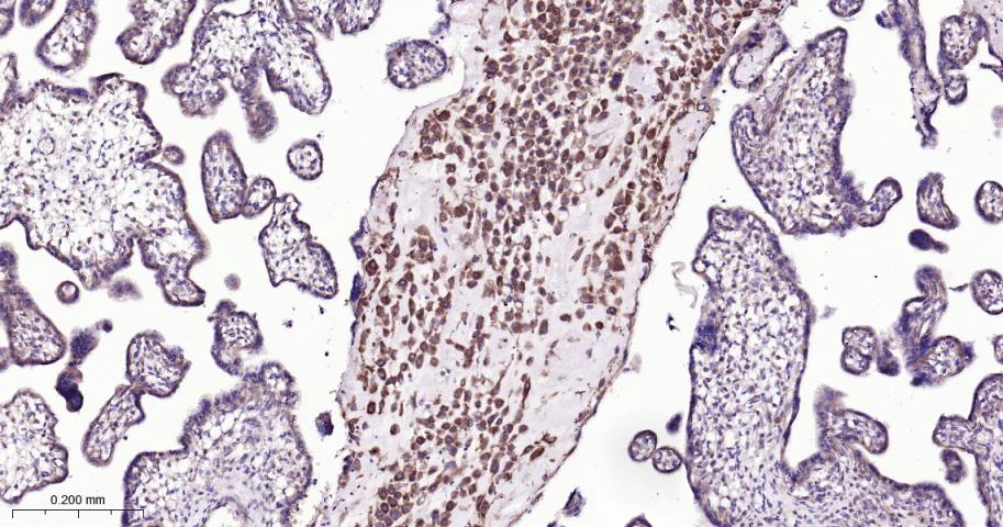 Paraformaldehyde-fixed, paraffin embedded Human placenta; Antigen retrieval by boiling in sodium citrate buffer (pH6.0) for 15 min; Antibody incubation with ATG5 Monoclonal Antibody, Unconjugated(bsm-52596R) at 1:200 overnight at 4°C, followed by conjugation to the bs-0295G-HRP and DAB (C-0010) staining.