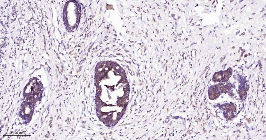 Paraformaldehyde-fixed, paraffin embedded Human Breast Cancer; Antigen retrieval by boiling in sodium citrate buffer (pH6.0) for 15 min; Antibody incubation with ATG5 Monoclonal Antibody, Unconjugated(bsm-52596R) at 1:200 overnight at 4°C, followed by conjugation to the bs-0295G-HRP and DAB (C-0010) staining.