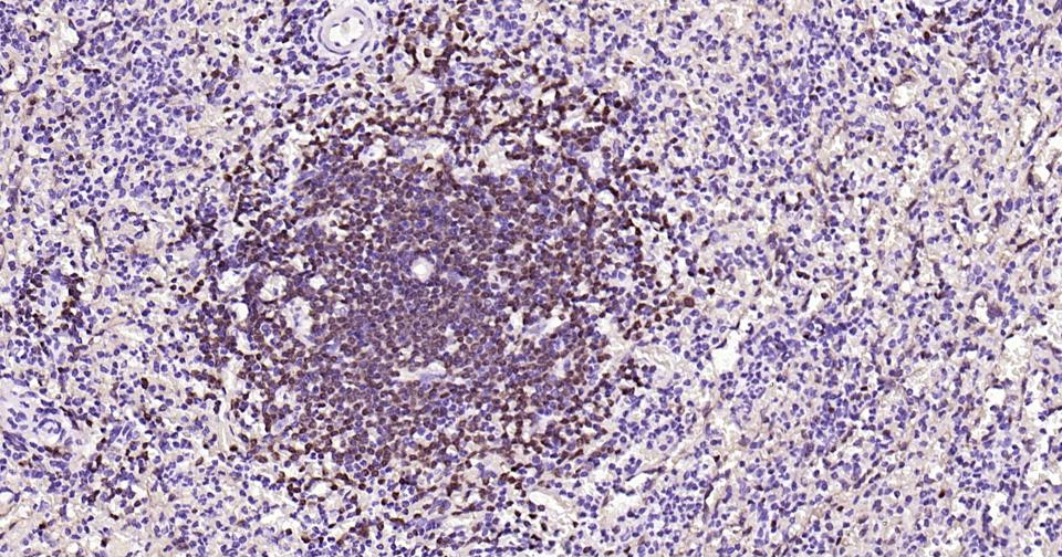 Paraformaldehyde-fixed, paraffin embedded Human Spleen; Antigen retrieval by boiling in sodium citrate buffer (pH6.0) for 15 min; Antibody incubation with BOB1 Monoclonal Antibody, Unconjugated(bsm-34182M) at 1:200 overnight at 4°C, followed by conjugation to the SP Kit (Mouse, sp-0024) and DAB (C-0010) staining.