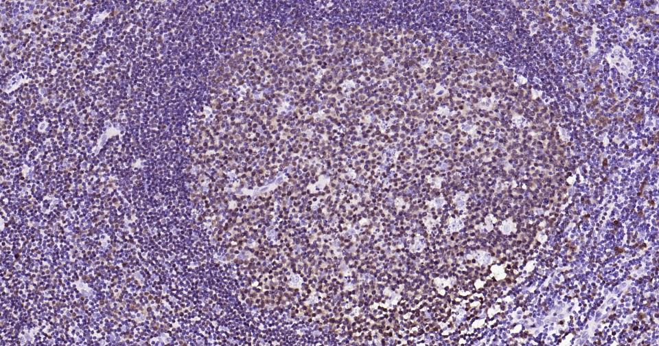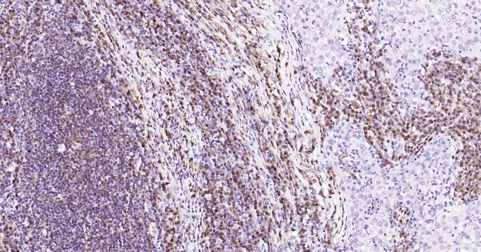 Paraformaldehyde-fixed, paraffin embedded Human Lymph; Antigen retrieval by boiling in sodium citrate buffer (pH6.0) for 15 min; Antibody incubation with BOB1 Monoclonal Antibody, Unconjugated(bsm-34182M) at 1:200 overnight at 4°C, followed by conjugation to the SP Kit (Mouse, sp-0024) and DAB (C-0010) staining.