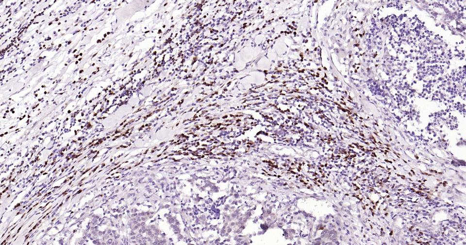 Paraformaldehyde-fixed, paraffin embedded Human Gastric Cancer; Antigen retrieval by boiling in sodium citrate buffer (pH6.0) for 15 min; Antibody incubation with BOB1 Monoclonal Antibody, Unconjugated(bsm-34182M) at 1:200 overnight at 4°C, followed by conjugation to the SP Kit (Mouse, sp-0024) and DAB (C-0010) staining.