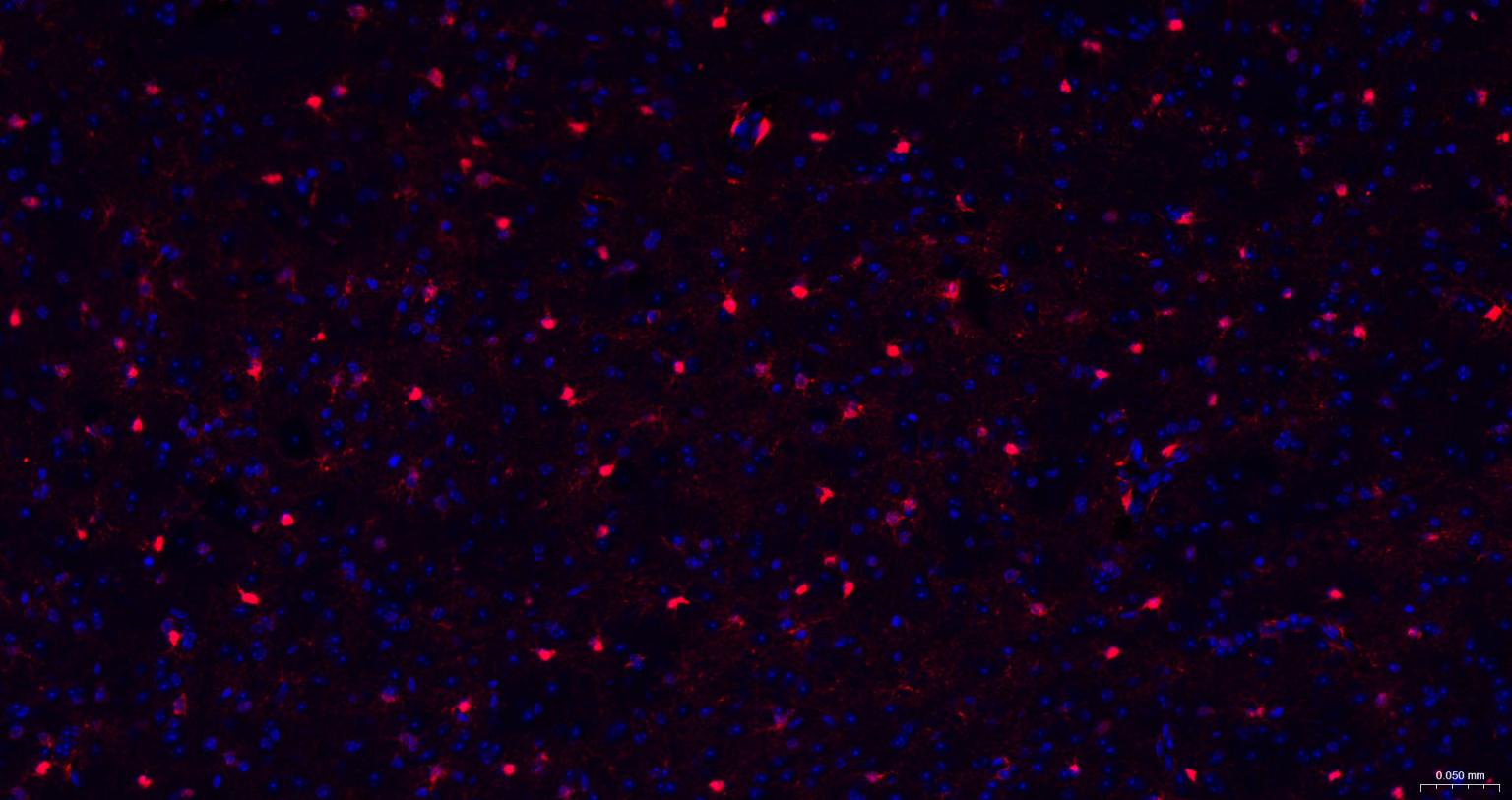 Paraformaldehyde-fixed, paraffin embedded Mouse Cerebrum; Antigen retrieval by boiling in sodium citrate buffer (pH6.0) for 15 min; The section was incubated with S100A1 Monoclonal Antibody, Unconjugated (bsm-63044R) at 1:200 overnight at 4°C. Followed by conjugated Goat Anti-Rabbit IgG antibody (Red, bs-0295G-BF594), DAPI (blue, C02-04002) was used to stain the cell nuclei.