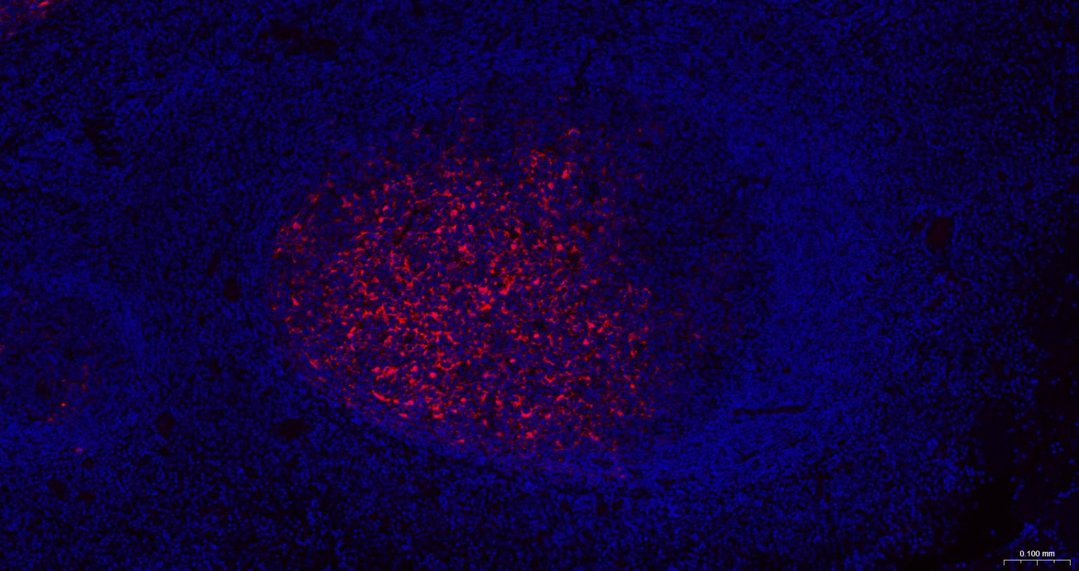 Paraformaldehyde-fixed, paraffin embedded Human Chronic tonsillitis; Antigen retrieval by boiling in sodium citrate buffer (pH6.0) for 15 min; The section was incubated with S100A1 Monoclonal Antibody, Unconjugated (bsm-63044R) at 1:200 overnight at 4°C. Followed by conjugated Goat Anti-Rabbit IgG antibody (Red, bs-0295G-BF594), DAPI (blue, C02-04002) was used to stain the cell nuclei.