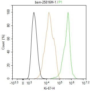 The Hela (H) cells were fixed with 4% PFA (10 min at r.t.) and then permeabilized with 90% ice-cold methanol for 20 min at -20℃,the cells then were incubated in 5%BSA to block non-specific protein-protein interactions (30 min at r.t.), followed by secondary antibody incubation for 40 min at room temperature. Primary Antibody (green):Mouse Anti-Ki-67 antibody (bsm-258161M): 1 μg/10^6 cells; Isotype Control (orange): Mouse IgG (bs-0296P). Blank control (black): PBS. Acquisition of 20,000 events was performed.