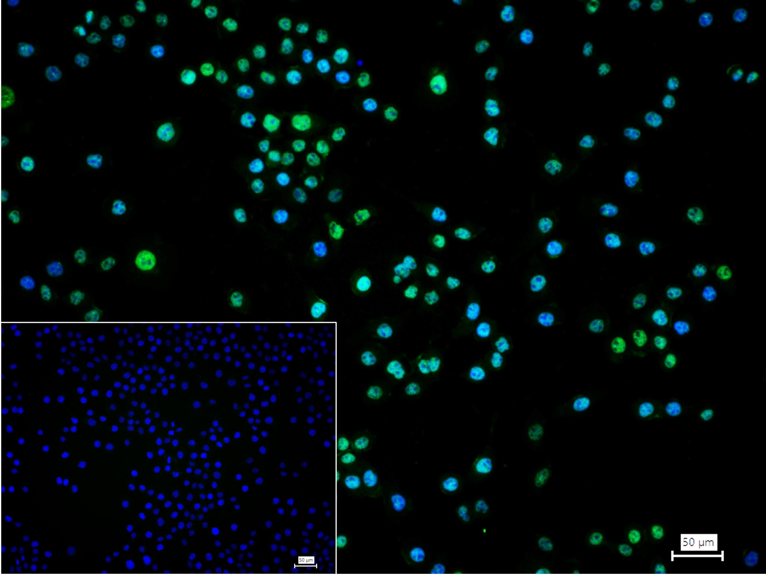 4% Paraformaldehyde-fixed Hela (H) cell; Triton X-100 at r.t. for 20 min; Antibody incubation with (Ki-67) monoclonal Antibody, unconjugated (bsm-0061R) 1:100, 90 min at 37°C; followed by conjugated Goat Anti-Mouse IgG antibody (green, bs-60296G-FITC) at 37°C for 90 min, DAPI (blue, C02-04002) was used to stain the cell nuclei. PBS instead of the primary antibody was used as the blank control.