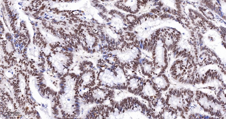 Paraformaldehyde-fixed, paraffin embedded Human Colon Cancer; Antigen retrieval by boiling in sodium citrate buffer (pH6.0) for 15 min; The section was incubated with Ki-67 Monoclonal Antibody, Unconjugated (bsm-25816M) at 1:1000 overnight at 4°C, followed by conjugation to the bs-40296G-HRP and DAB (C-0010) staining.